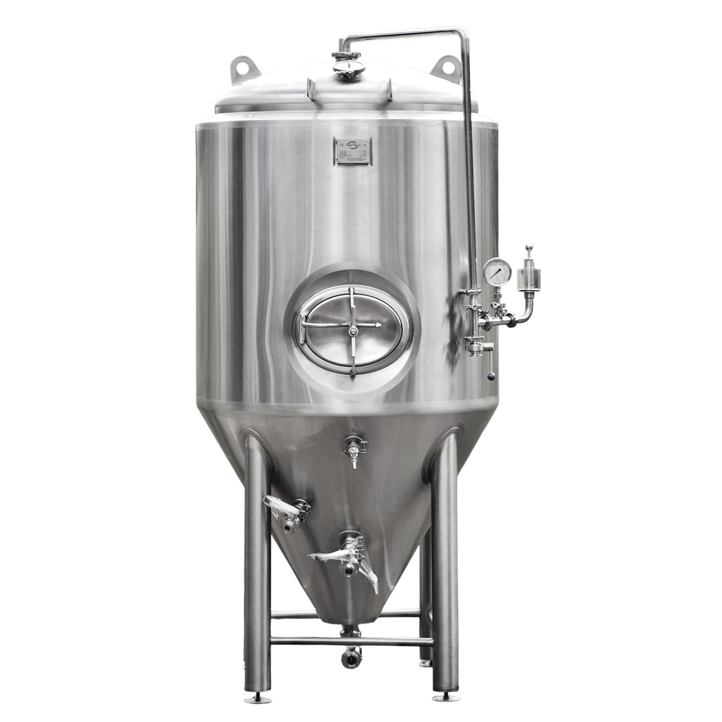 Fullutrustad trycktålig, kylmantlad cylindrokonisk kombitank i rostfritt stål avsedd för jäsning, lagring och kolsyresättning.